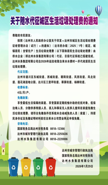 为进―步规范城区生活垃圾处理费收缴,方便广大市民朋友缴费,自2026年起达州市城区居民生活垃圾处理费由达州水务集团有限公司代征(以下简称达州水务集团)。现将有关事项告知如下: